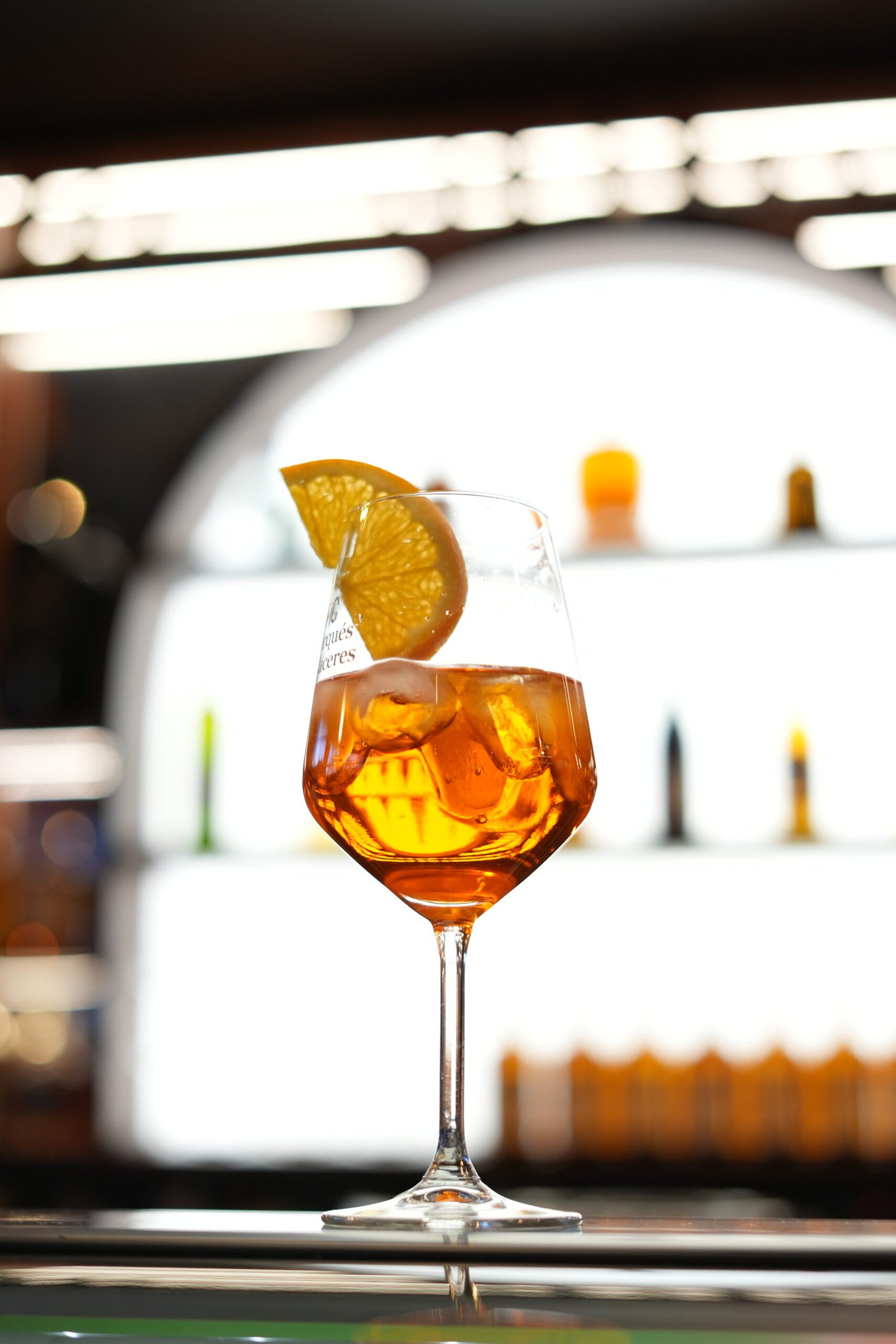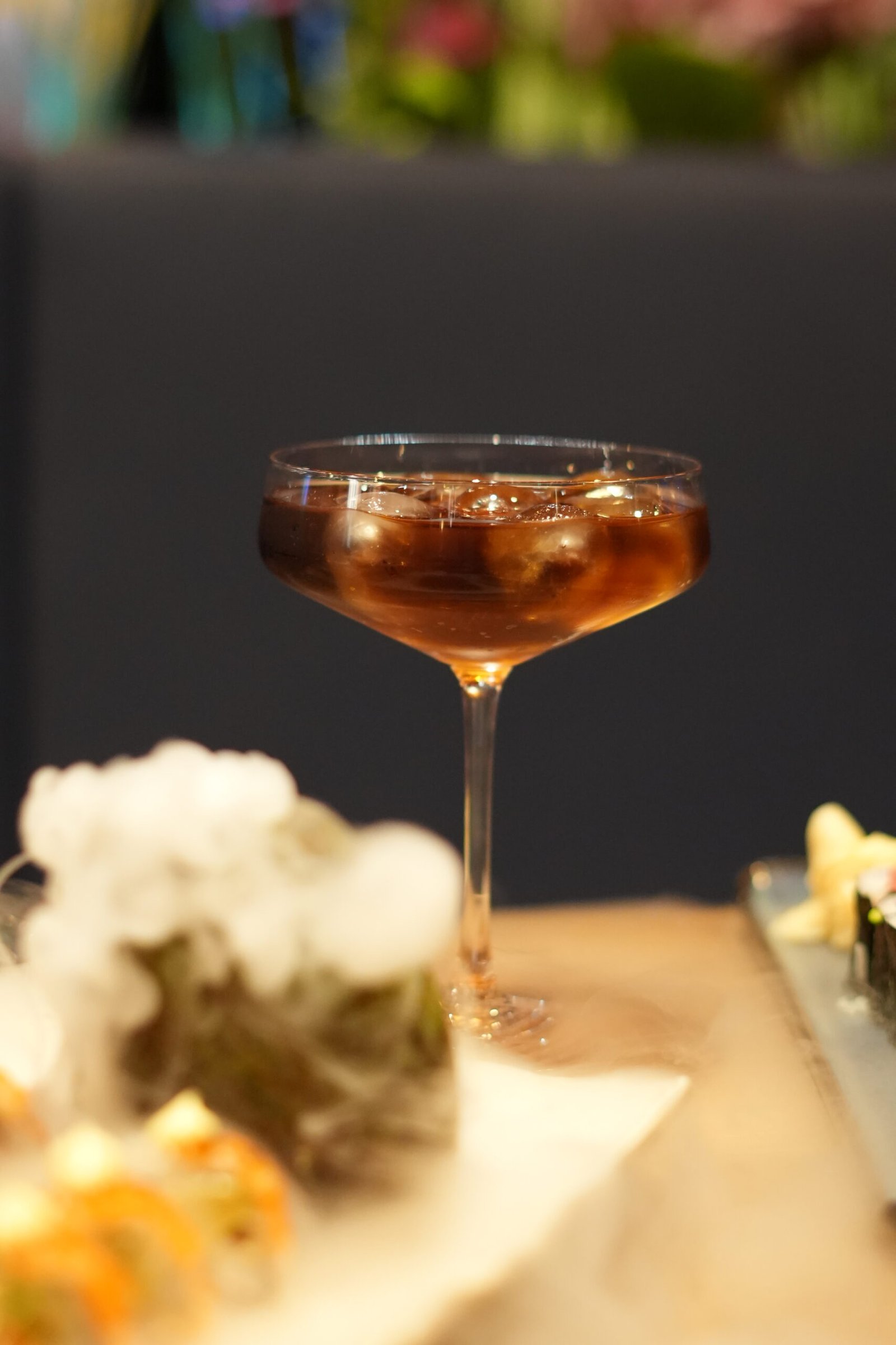Das Interieur besticht durch große Wandmalereien, künstliche Kirschblüten und eine auffällige Bar als stilistischen Blickfang